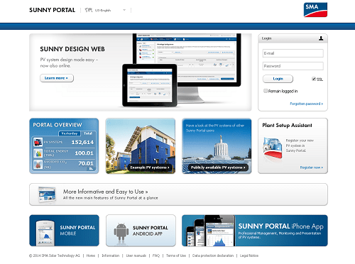 Sunny Portal provides free system monitoring for photovoltaic plants throughout the world and currently supports more than 150,000 systems. It allows system owners to access PV system data anytime and anywhere via the Internet or Sunny Portal application for iPhone, iPad, iPod touch and Android phones. Automatic product updates ensure that the device firmware is always up to date, while any operation irregularities or interferences are quickly detected, and an email notification is sent through the Sunny Portal.